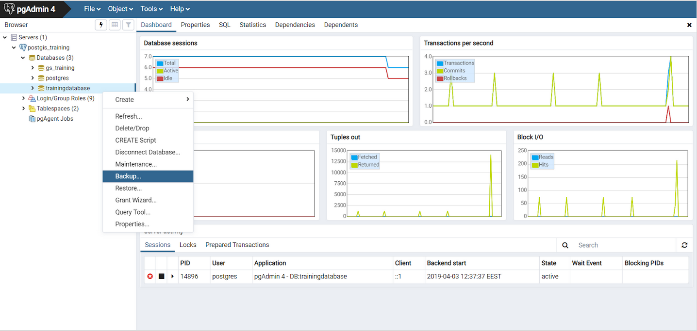 Let’s create a backup of the trainingdatabase with pgAdmin. Right click the trainingdatabase and click Backup…