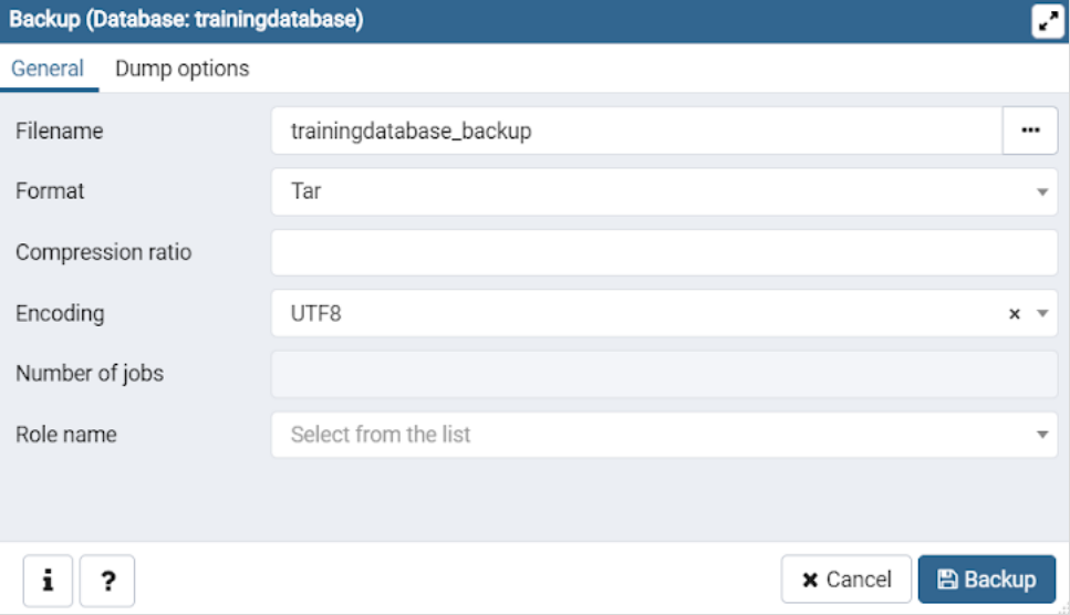 Fill the filename in the Backup window as “trainingdatabase_backup”. Make sure the format is Tar and the encoding is UTF8.