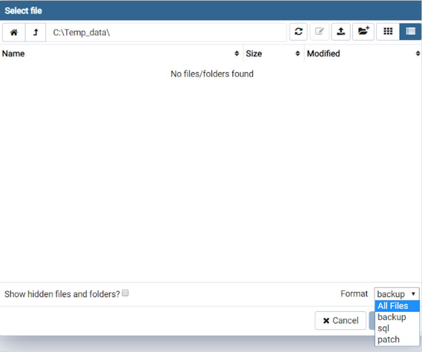 If you can’t find the backup file, set the Format to All Files in the bottom right corner of the Select file window. You can inspect the features which will be restored before the restoration takes place with the Display Object feature.